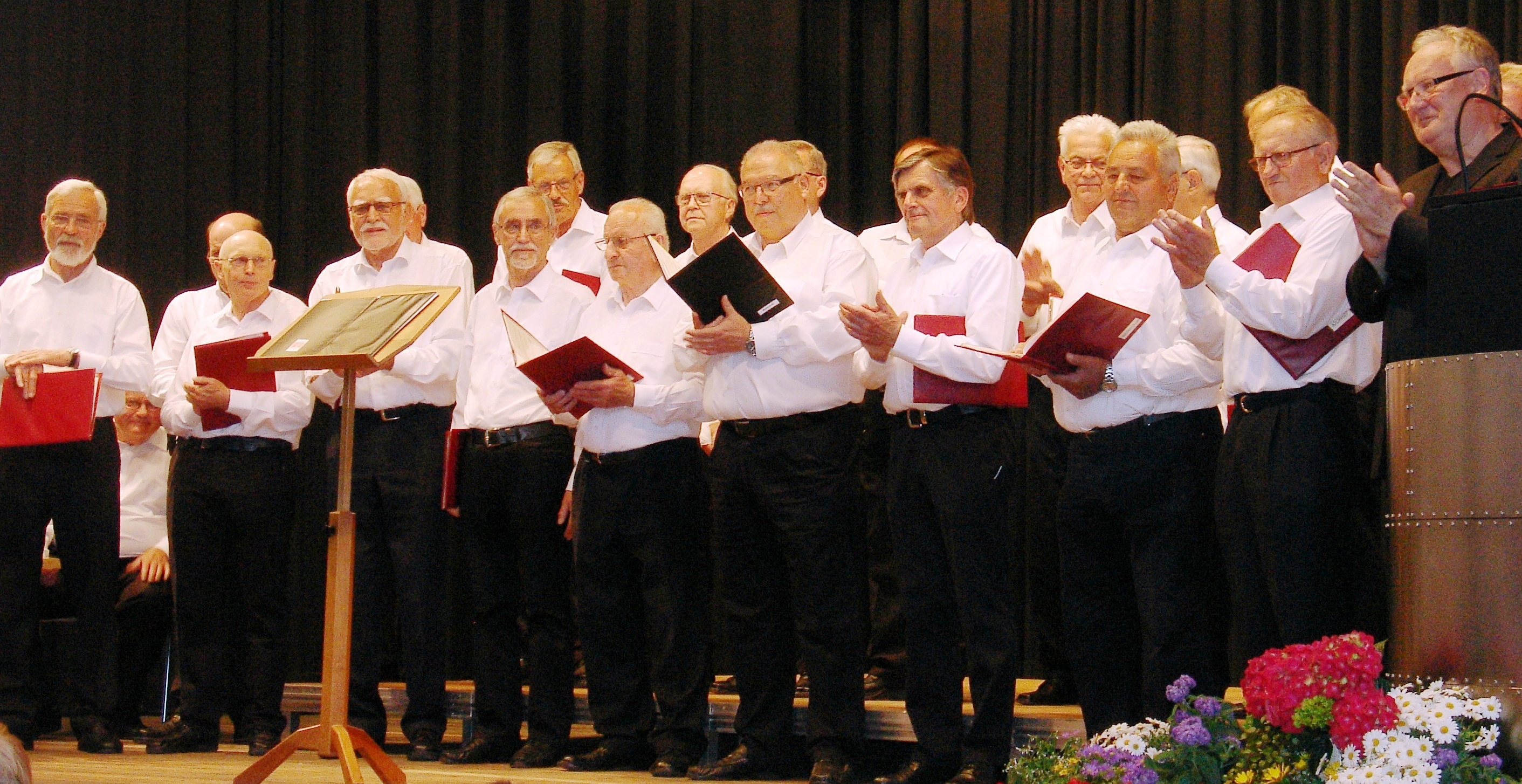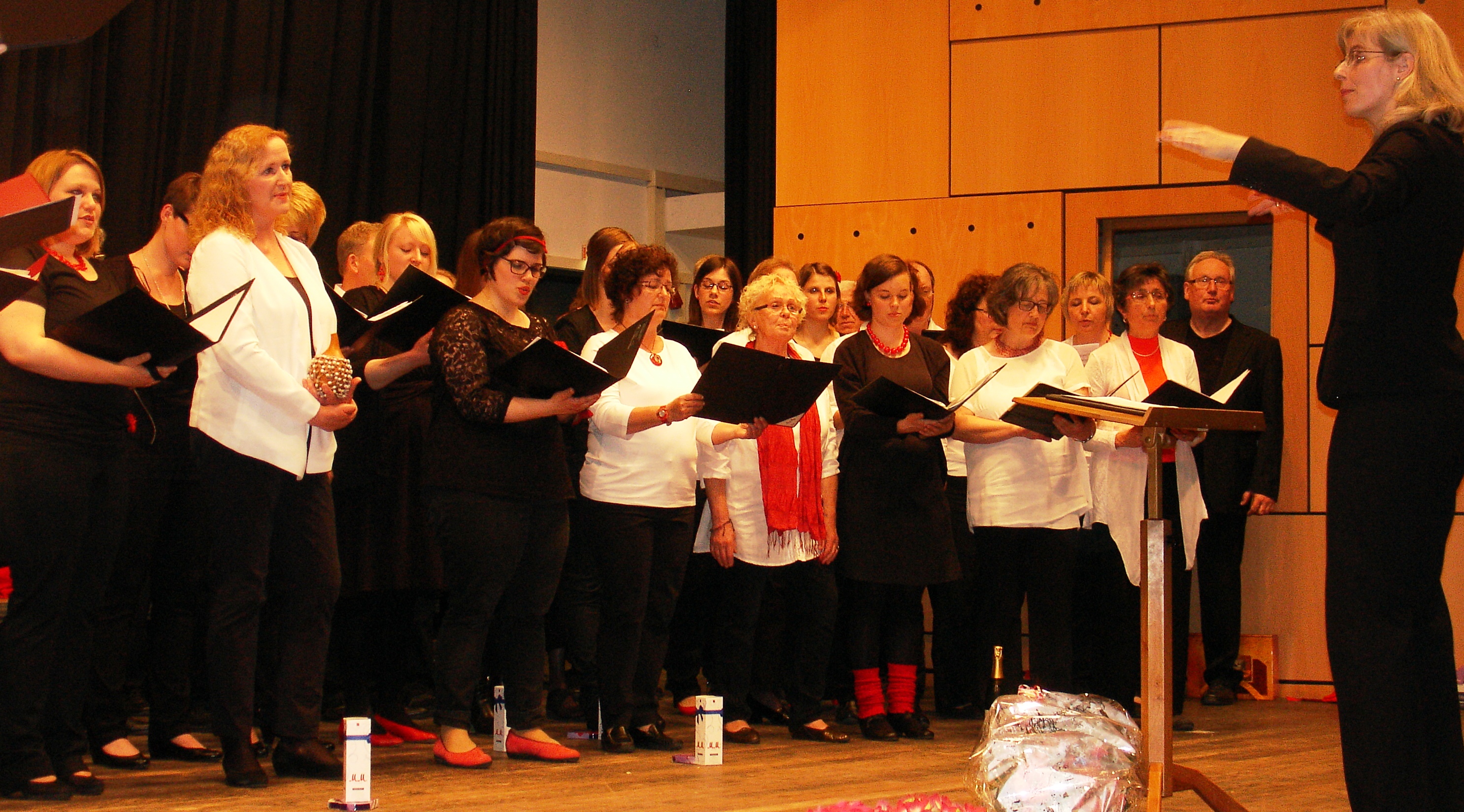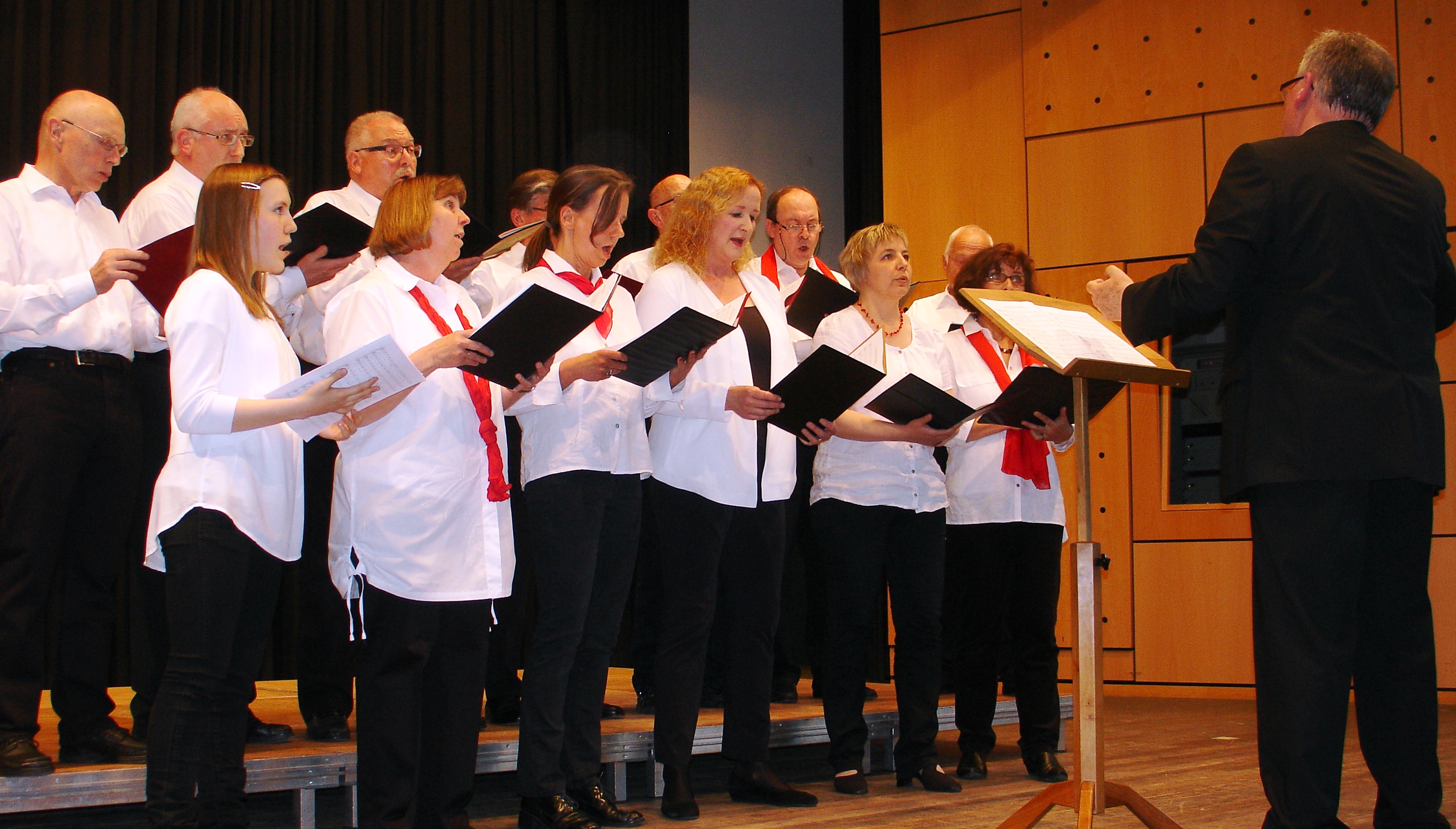 Mit einem der schönsten romantischen Frühlingslieder, dem „Frühlingsglauben“ von Friedrich Silcher, eröffnete der Männerchor das Konzert. Zur Kirchenmusik der Renaissance gehört das anschließende, sehr fein gesungene „Benedicam Dominum“ von Giovanni Croce. 111 Jahre nach dem Tod dieses venezianischen Kapellmeisters und Komponisten schrieb Johann Sebastian Bach seine berühmte „Invention Nr. 1“ für Tasteninstrumente. Wolfgang Layer inszenierte sie als Dialog zwischen Tenören und Bässen im Stil der legendären Swingle Singers, mit wenigen Tonsilben auf perlenden Achtel- und Sechzehntelnoten gesungen. Am Klavier begleitete Sabine Layer. Franz Schuberts „Lindenbaum“ brachte die Zuhörer zurück zur Männerchorliteratur und zu dem, was man heute „Kultsongs“ zu nennen pflegt. Zu dieser Kategorie gehört auch Hubert von Goiserns Ballade „Weit, weit weg“. Zum Schluss des Männerchorauftritts gab es musikalische Blumen am Vorabend zum Muttertag mit Udo Jürgens ironischem Lied für alle notorischen Pechvögel dieser Welt: „Vielen Dank für die Blumen.“