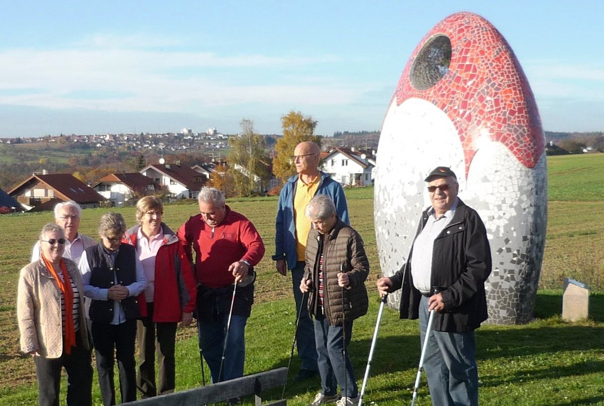 Am Mittwoch, 4. November 2015, führte die Wanderung ins Naturfreundehaus nach Lichtenwald. Auf dem Bild präsentieren sich einige der Wanderer auf der Höhe über dem Teilort Hegenlohe, wo man einen herrlichen Blick über den Schurwald und bis zur Alb genießt. Dort wurde vor einem Jahr die drei Meter hohe Skulptur „Augenblick“ aufgestellt, die ein Lichtenwalder Bürger gestiftet und das Künstlerehepaar Heinze mit einem Fliesenmosaik zu einem eindrucksvollen Kunstwerk gestaltet hat.