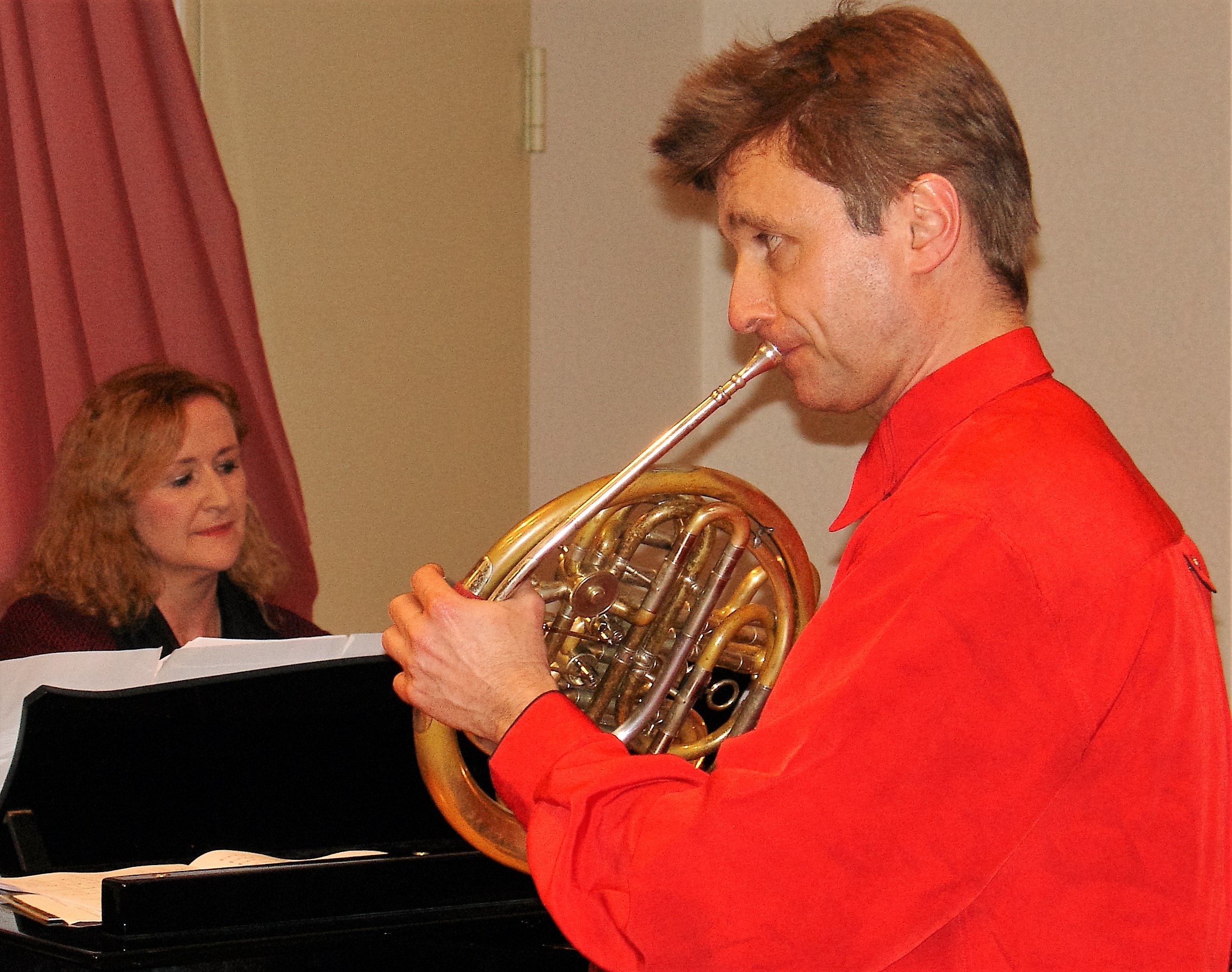 Die beiden Instrumentalsolisten Sabine Layer am Klavier und Flynn Marquardt am Horn.