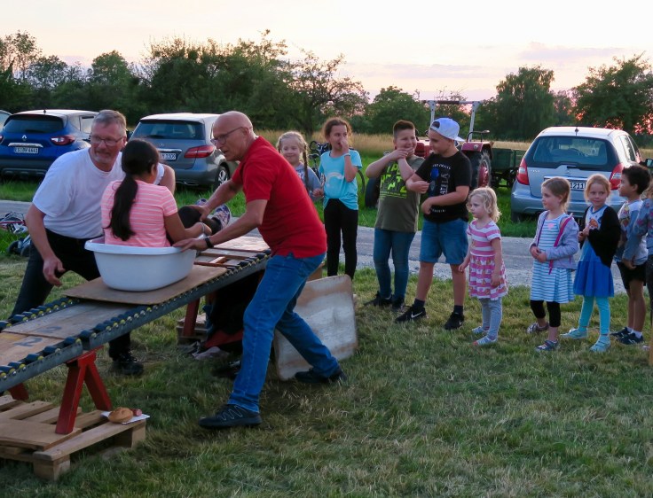 Auch das Feuer selbst war rekordfähig. Der von den Helfern der Firma Ayasse & Unrath mit ihrem Bagger aufgeschichtete Holzstoß war nach Schätzung der Fachleute noch nie so hoch wie in diesem Jahr und entsprechend loderten die Flammen. Mehrmals musste die Feuerwehr die Wiese, den neu geteerten Weg und die nächsten Bäume kühlen, um die Hitze in Grenzen zu halten. Herauszuheben ist auch der Einsatz der vielen Helferinnen und Helfern aus den beiden Chören des Liederkranz. Mit einer Roten vom Grill, einem Pfefferbeißer oder den von Gabi Grau zubereiteten Kräuterkäsebroten und dem reichhaltigen Getränkeangebot versorgt, saß oder stand man zusammen, plauderte und sah den Flammen zu. Und für die vielen Kinder war die Rollenbahn wieder das große Ereignis. Kaum war am nächsten Tag die Wiese abgeräumt, trommelte schon wieder der Regen. (–rer)
