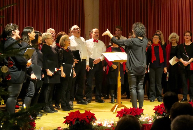 Weniger dem Stil der bekannten Weihnachtslieder entsprachen drei eher neuzeitliche Stücke. Das gilt besonders für den aus einem amerikanischen Lied übernommenen und im entsprechenden Takt gesungenen „Trommelmann“. Und diese Trommel war tatsächlich vorhanden. Geschlagen hat sie die Leiterin von Conga Crash, Carmen Schäfer und ihr Spiel gab dem Lied eine ganz besondere Note. Aus neuer Zeit stammt auch das von Udo Jürgens kurz vor seinem Tod geschriebene aber wie Wolfgang Digel sagte, relativ selten gesungene Lied „Wünsche zur Weihnachtszeit“. Abgeschlossen wurde der musikalische Teil des Abends durch das von beiden Chören gesungene altbekannte, aber für Frauen- und Männerstimmen anspruchsvoll bearbeitete Weihnachtslied „Fröhliche Weihnacht überall“.