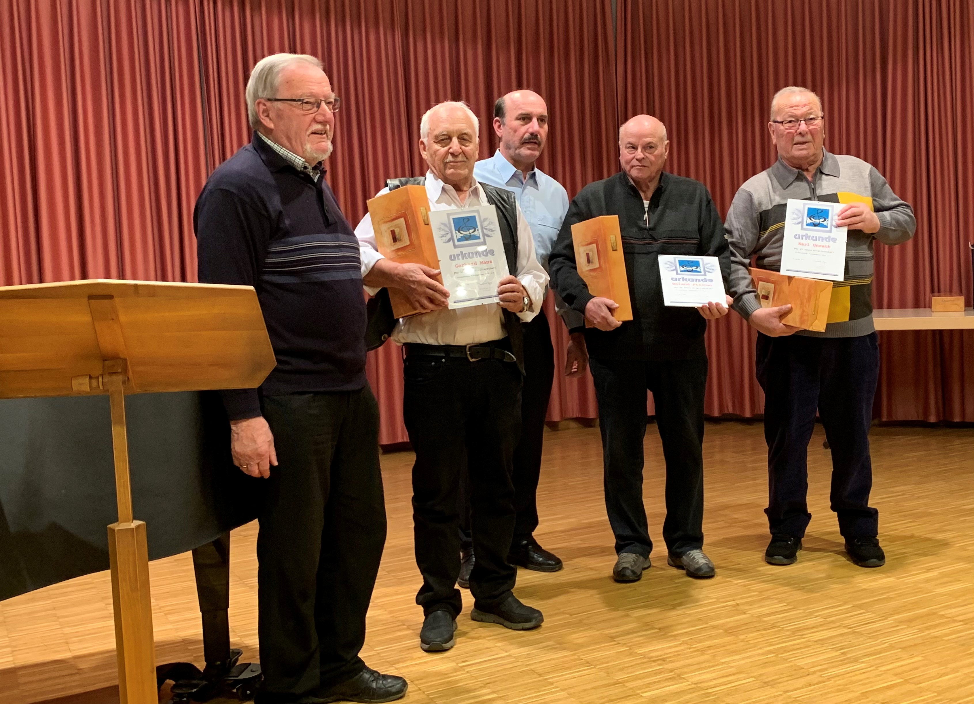 Walter Stürzl hatte nun die ehrenvolle Aufgabe, vier Mitglieder für ihre langjährige Mitgliedschaft zu ehren. Im Einzelnen waren das Karl Unrath für 65 Jahre Mitgliedschaft, Roland Fischer, Gerhard Mauz und Karl Kreuzer für je 60 Jahre Mitgliedschaft.