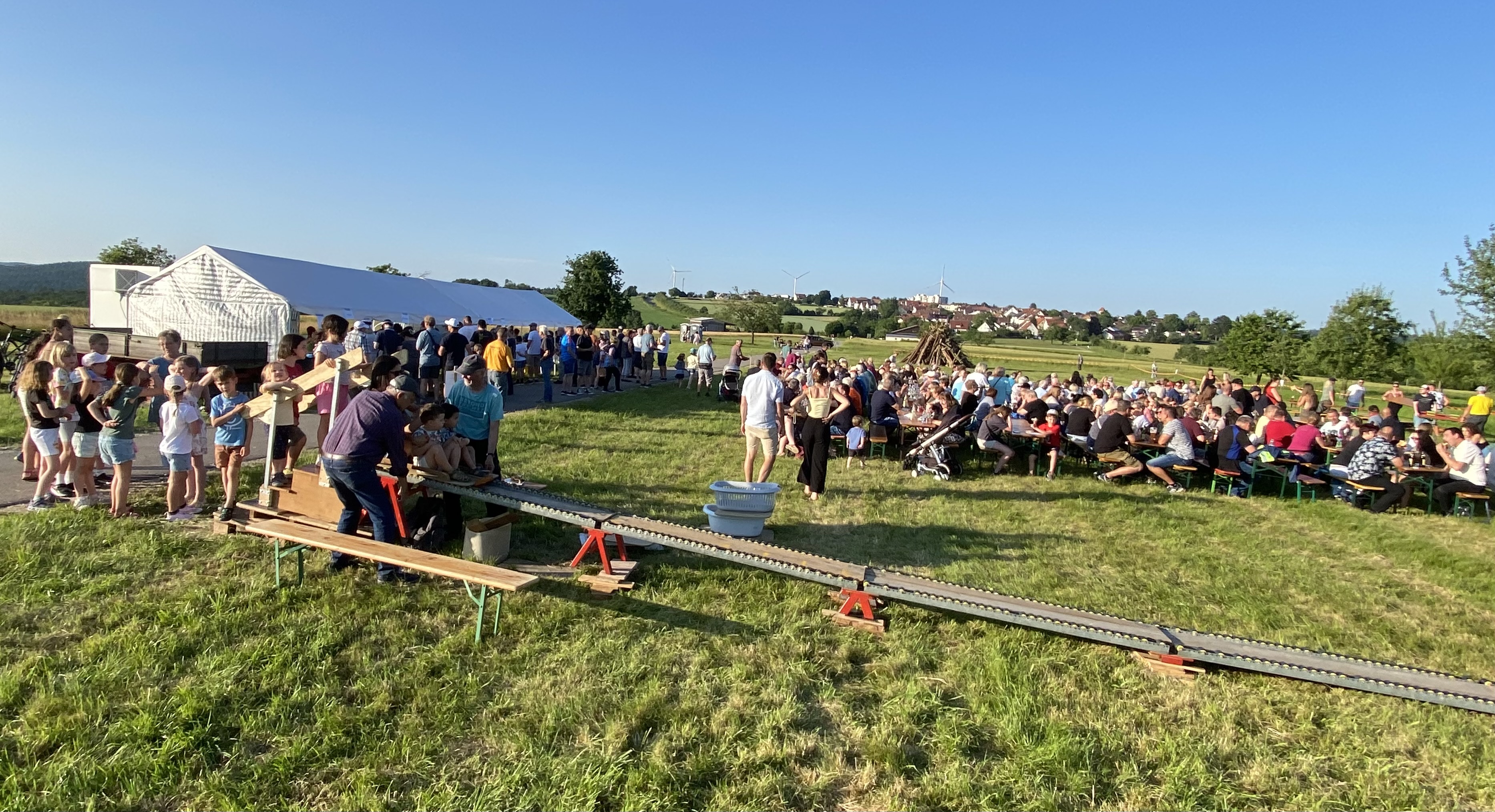 In der Vorbereitung hatten die vielen Helfer den ganzen Tag über bei den hohen Temperaturen die Partyzelte für die Essens- und Getränkeausgabe aufgebaut und die Tische mit den Bänken aufgestellt – eine schweißtreibende Arbeit – sodass alles zum Beginn der Veranstaltung um 18:00 Uhr hergerichtet war. Und natürlich war auch der große Holzstoß für das Feuer an der vorgesehenen Feuerstelle aufgeschichtet. In diesem Jahr hat man dafür ausschließlich Holz aus dem Wald verwendet.